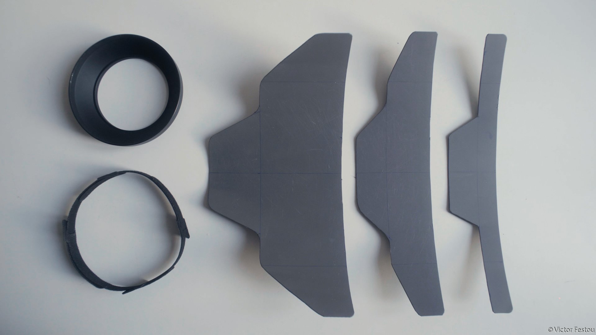 Le pare-soleil en métal a été trouvé sur eBay. Les découpes ont été faites dans une planche à découper Ikea en plastique. Le tout est clipsé ensemble par des bandes serre-câbles velcro.