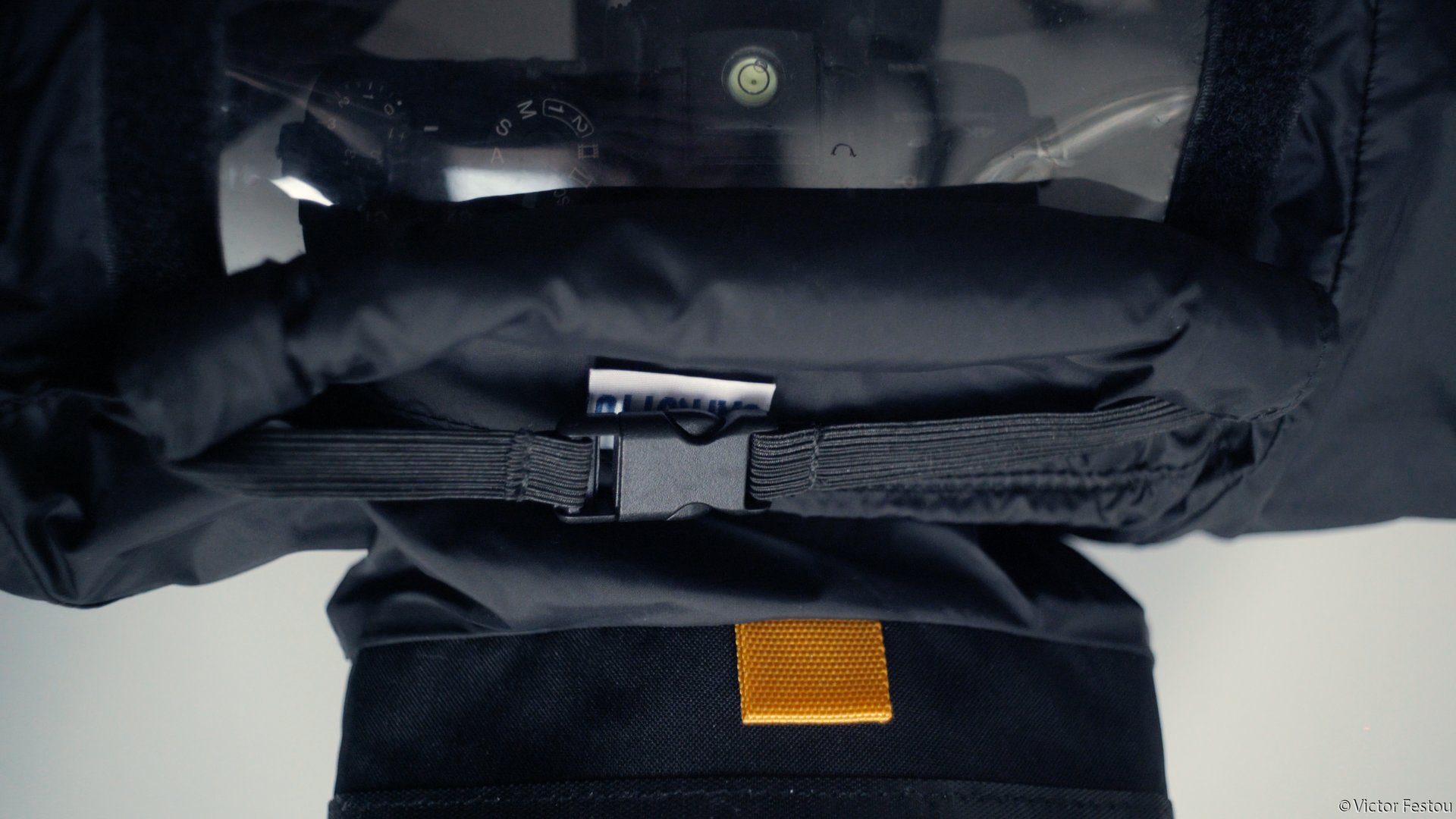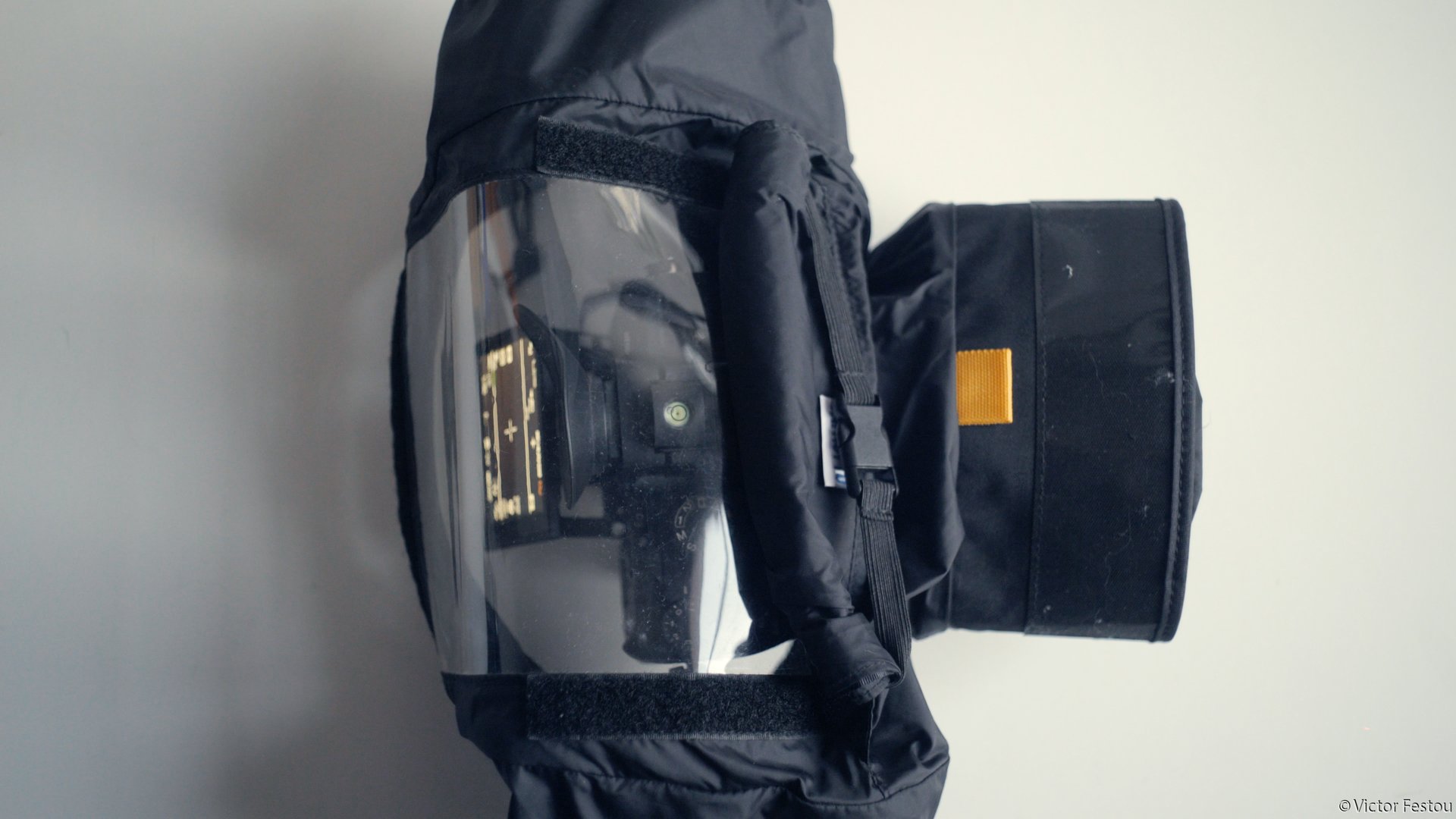 Un désavantage est que si la protection est juste assez grande pour couvrir le boîtier et une optique de taille moyenne, il ne faut pas espérer pouvoir protéger un téléobjectif avec. La protection contre les projections n’est aussi pas idéale, car le dessous du boîtier n’est pas couvert.