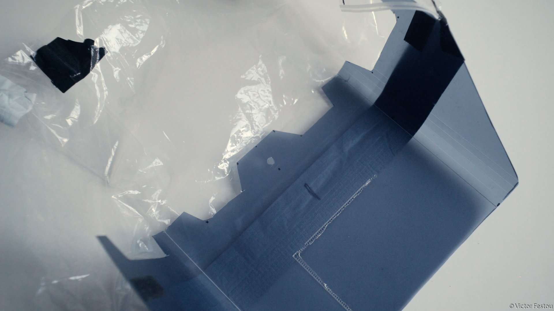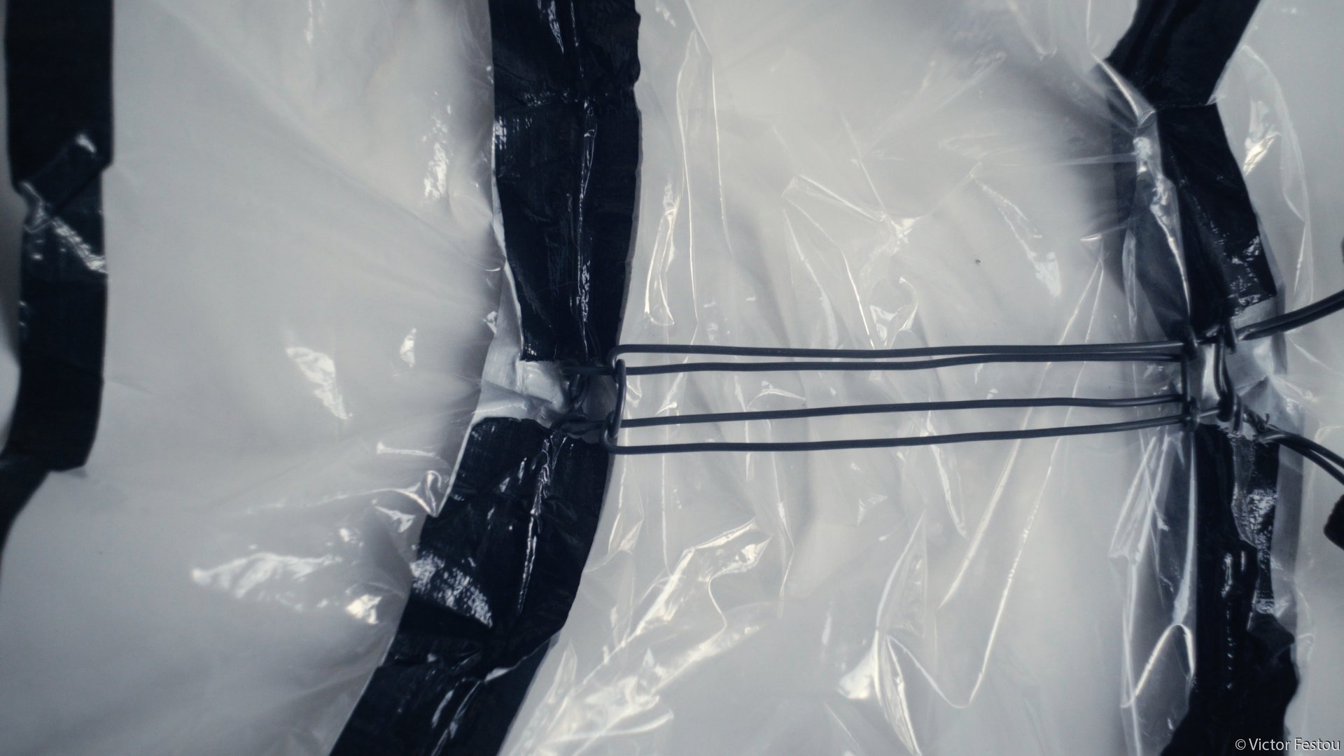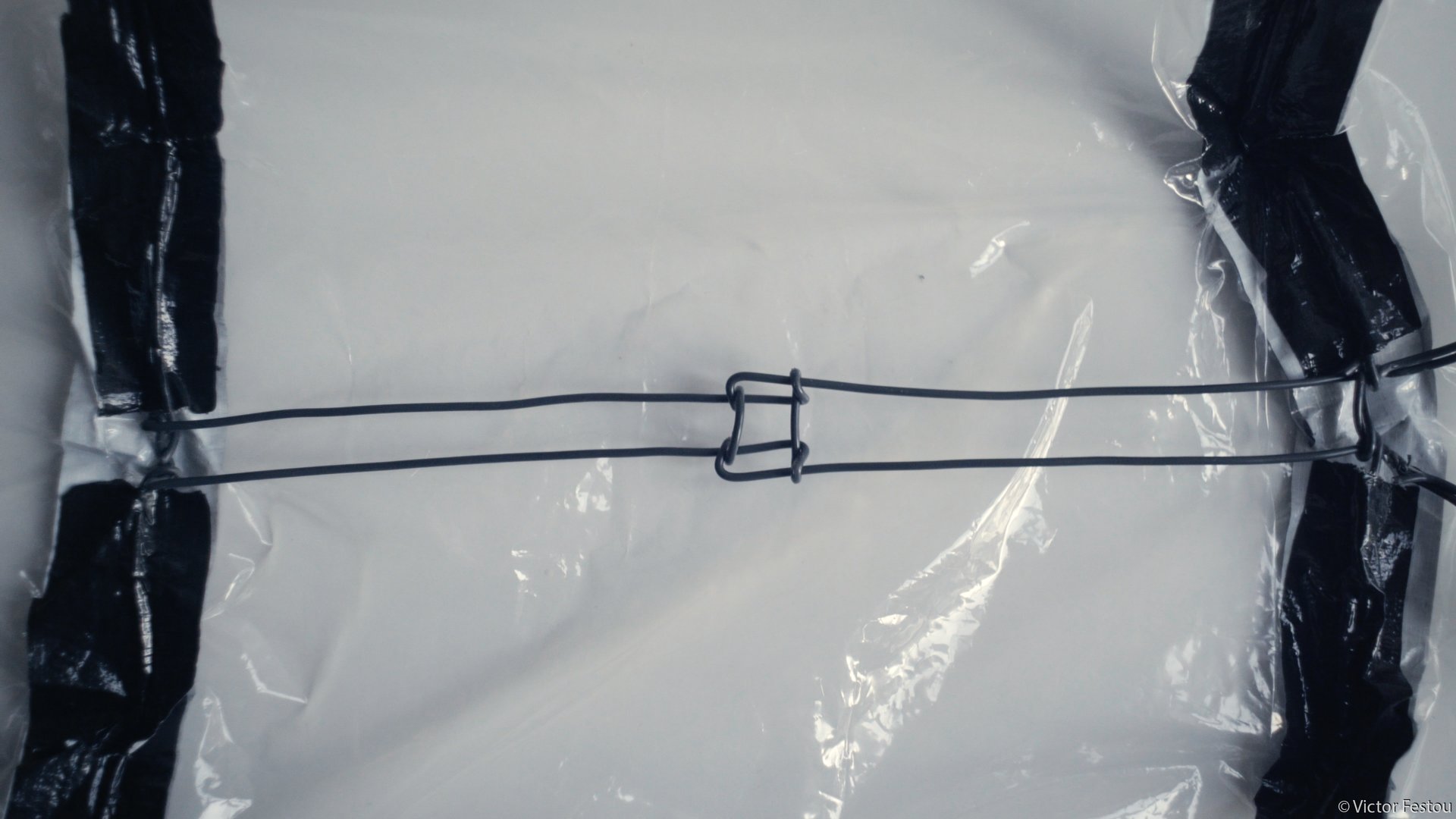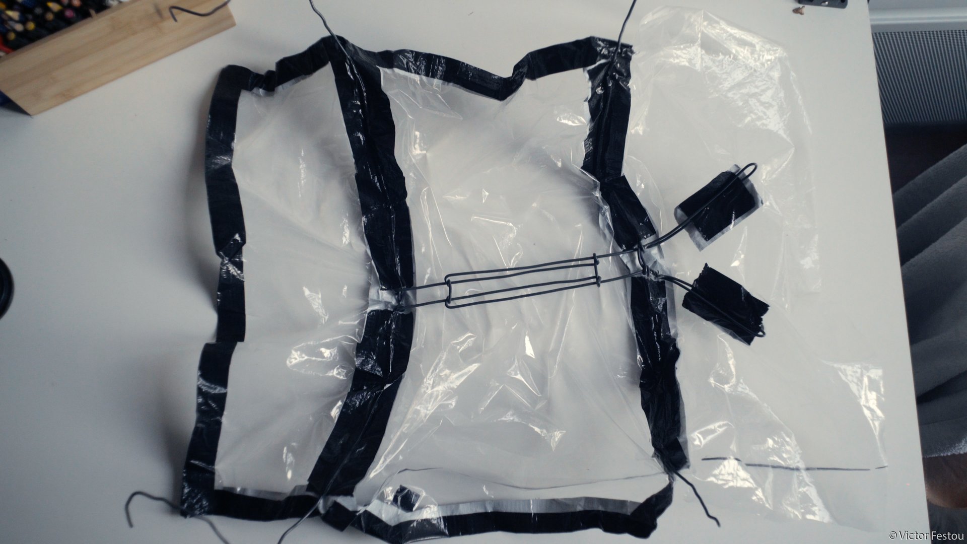 Elle a été réalisée par le même fil de fer maintenu par du gaffer mais cette fois avec un rideau de douche plastique transparent. Tout à été découpé en une seule pièce pour éviter les fuites.