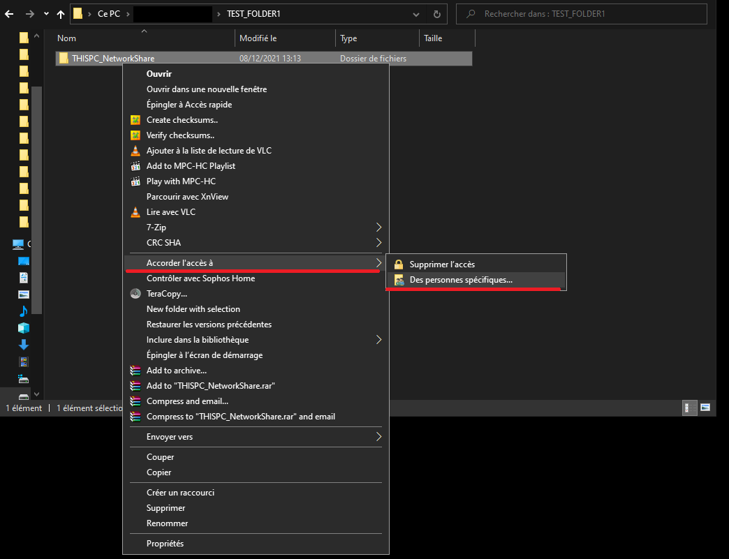 Pour cela, sélectionner le dossier que l’on souhaite partager, clic-droit puis « Accorder l’accès à : » puis « Des personnes spécifiques ».