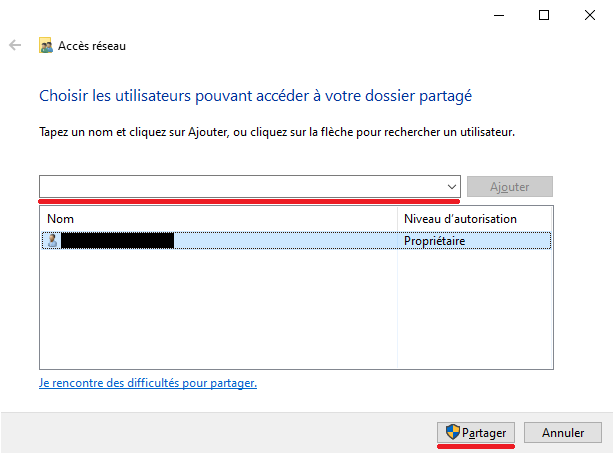 Dans la fenêtre qui s’ouvre, sélectionner des utilisateurs spécifiques ou « Tout le monde », puis « Partager ».