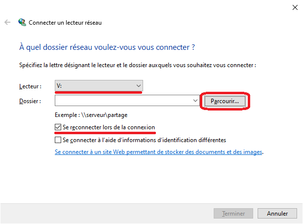 Sur l’autre ordinateur, ouvrir une fenêtre Explorer et aller à « Ce pc », puis dans l’onglet « Ordinateur » sélectionner « Connecter un lecteur réseau ». Dans la fenêtre qui s’ouvre, choisir la lettre de lecteur puis sélectionner le dossier partagé au dessus dans « Parcourir » (la découverte réseau peut prendre quelques secondes). Noter le nom du dossier avant de cliquer « Terminer », qui devrait ressembler à : « \\NOMDUPC\NomduDossierPartagé ».