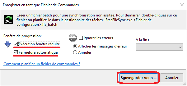 Dans la fenêtre qui s’affiche, sélectionner « Exécution fenêtre réduite » et « Fermeture automatique » pour que le logiciel n’ouvre pas une nouvelle fenêtre à chaque changement dans les dossiers cibles et que tout se fasse en fond.