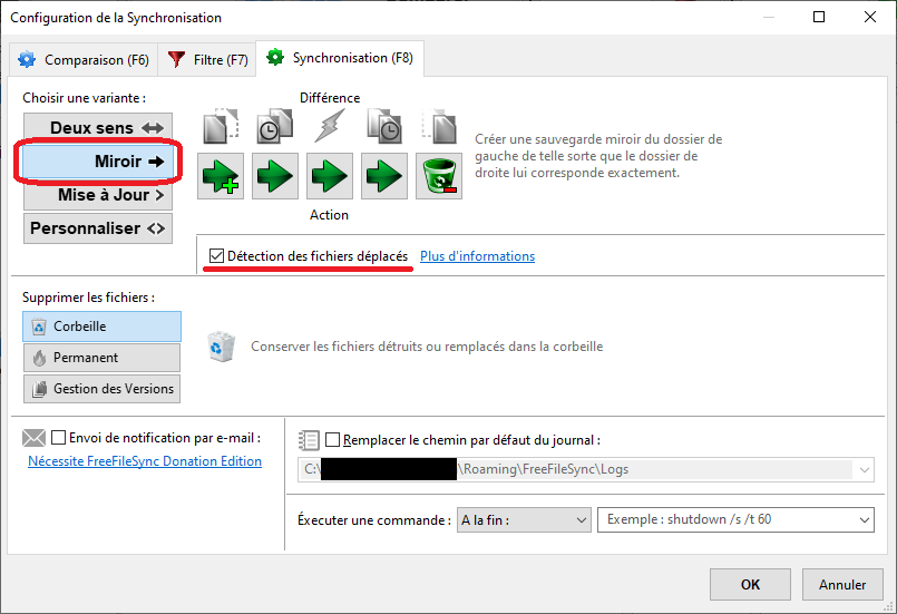 Dans le troisième onglet « Synchronisation », j’ai sélectionné l’option « Miroir », pour ne copier que les changements détectés du disque 1 vers le 2. Je coche la case « Détection des fichiers déplacés », très utile pour éviter des réécritures excessives lorsqu’on a juste réarrangé des fichiers dans de nouveaux dossiers (surtout dans le cas de rushes de plusieurs dizaines de Go). J’ai laissé l’option de suppression des fichiers sur « Corbeille », mais il est ici possible de garder les anciennes versions de fichiers supprimés, ce qui n’est pas utile dans mon cas.