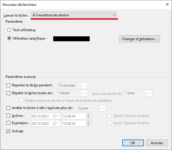 Passer à l’onglet « Déclencheurs », dans « Lancer la tâche », choisir « à l’ouverture de session » et choisir l’utilisateur actif. Le tutorial de Freefilesync recommande d’utiliser « au démarrage » mais le service ne s’exécutait pas tout le temps, alors qu’avec « à l’ouverture de session » je n’ai eu aucun problème.