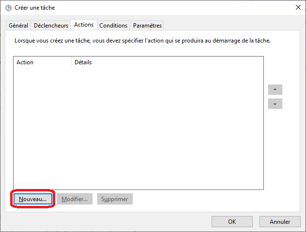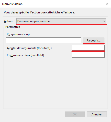 Dans l’onglet « Actions », cliquer « Nouveau » et choisir « démarrer un programme ». Dans la case « programme/script », naviguer jusqu’au dossier d’installation de Freefilesync et sélectionner RealTimeSync.exe. Dans la case « arguments », copier le chemin complet jusqu’au fichier script .ffs_real créé plus haut.