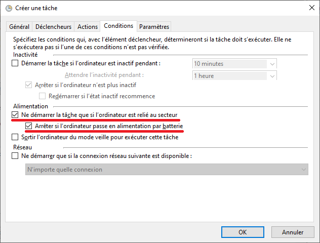 Toujours comme ci-dessus, enregistrer le script en .ffs_batch, ouvrir l’utilitaire RealTimeSync, importer le fichier .ffs_batch, enregistrer sous avec l’extension .ffs_real puis créer une tache dans le planificateur de tâche Windows. Attention, s’il s’agit d’un ordinateur portable, il faut dans l’onglet « Conditions » lors de la création d’une tache désélectionner les options « Ne démarrer la tache que si l’ordinateur est relié au secteur » et « Arrêter si l’ordinateur passe en alimentation par batterie » pour qu’elle se lance bien même sur batterie.