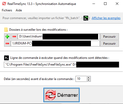 Le fichier enregistré sera au format .ffs_batch. S’il est lancé tel quel, il ouvrira Freefilesync mais l’on souhaite utiliser la fonction RealTimeSync. Pour cela, ouvrir l’utilitaire RealTimeSync.exe présent dans le dossier d’installation de FreeFileSync. Dans la fenêtre qui s’ouvre, importer le fichier .ffs_batch créé auparavant grâce à Fichier > Ouvrir. L’utilitaire charge la configuration et il ne suffit plus que de l’enregistrer avec Fichiers > Sauvegarder sous avec l’extension .ffs_real.