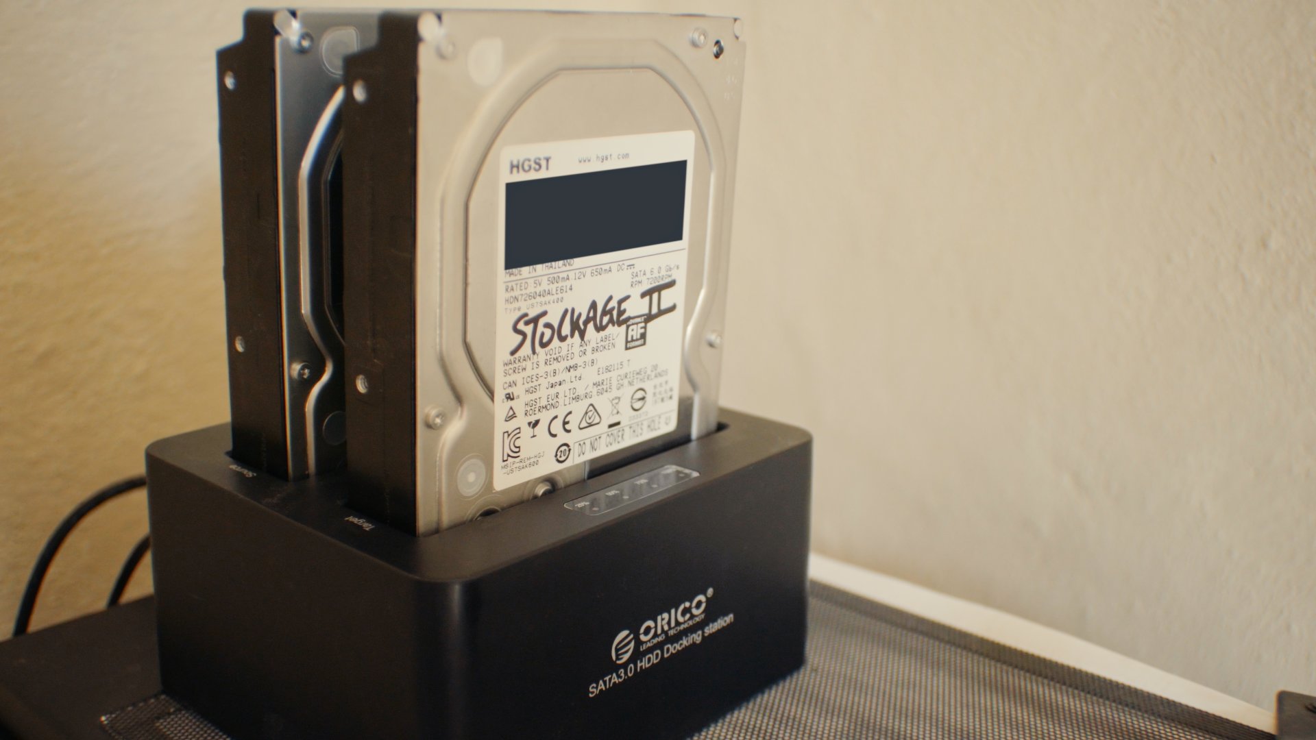 Les disques sont connectés par le biais d’un dock USB 3.0 pour disques durs (acceptant les formats 3.5″ et 2.5″) et permettant d’accéder aux deux disques simultanément (ce qui simplifie la vie pour effectuer les backups).