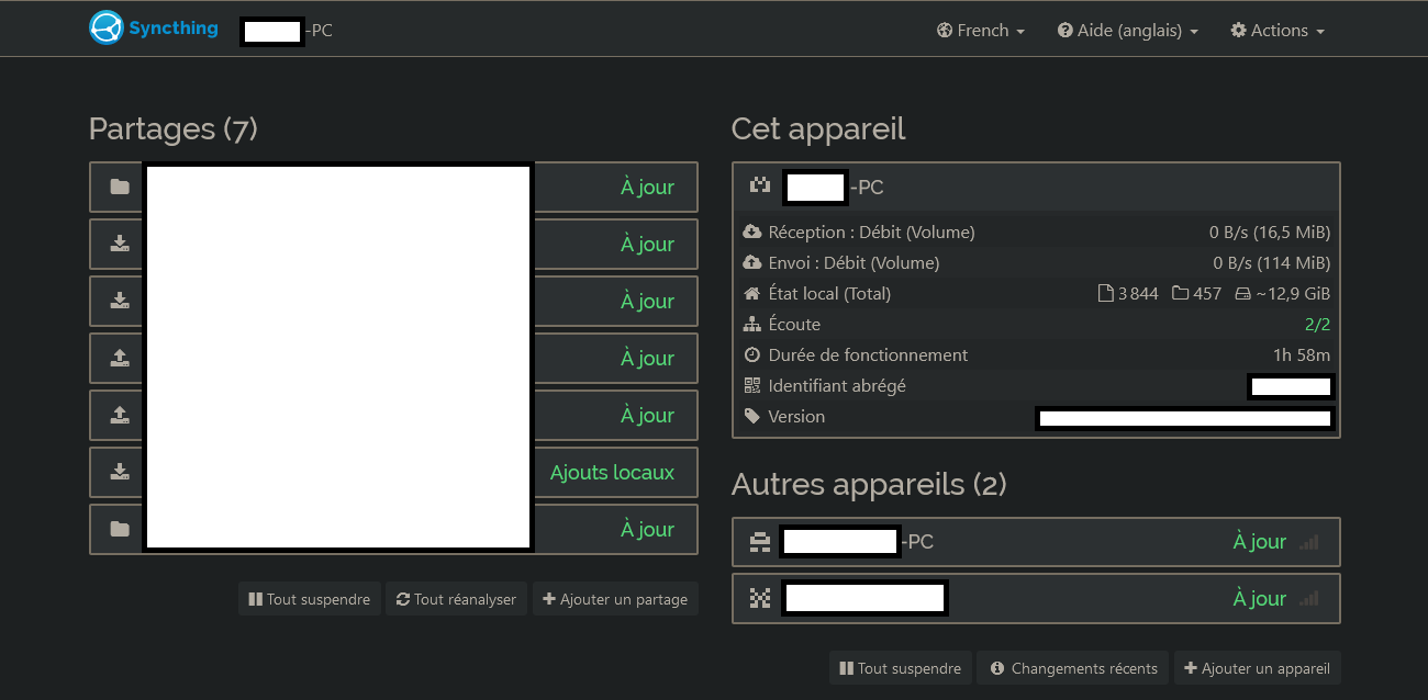 Une fois terminée, le partage de fichiers sera effectif et la synchronisation se lancera. Syncthing étant un logiciel pair à pair, il faut bien sûr que les deux postes soient allumés et connecté au réseau au même moment. L’avantage de cette méthode est qu’aucun tiers ou plateforme Cloud ne détient une copie de vos données.