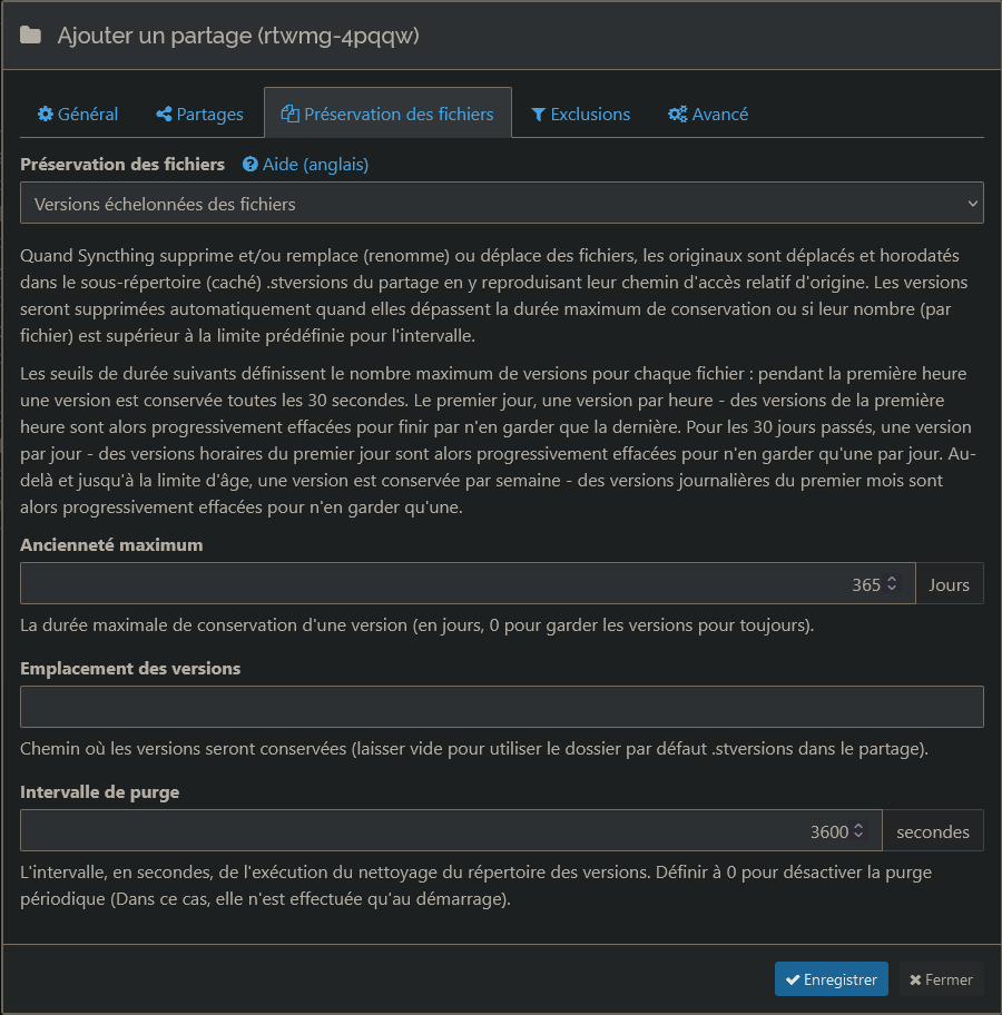 L’option la plus intéressante dans une utilisation de synchronisation de fichiers et documents est « Versions échelonnées des fichiers ». C’est pour cette option que je préfère aujourd’hui utiliser Syncthing par rapport à FreeFileSync précédemment présenté dans ce blog (Article ici).