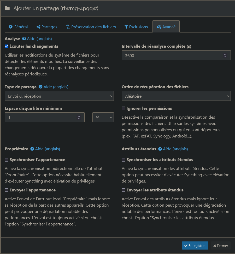 Enfin, l’onglet « Avancé » se révèle utile pour sélectionner le Type de partage. Pour une synchronisation simple, l’option de base « Envoi & Réception » est idéale, mais comme détaillé ci-dessous, l’option « Envoyer seulement » et « Recevoir seulement » peuvent se révéler plus adaptées suivant les utilisations.