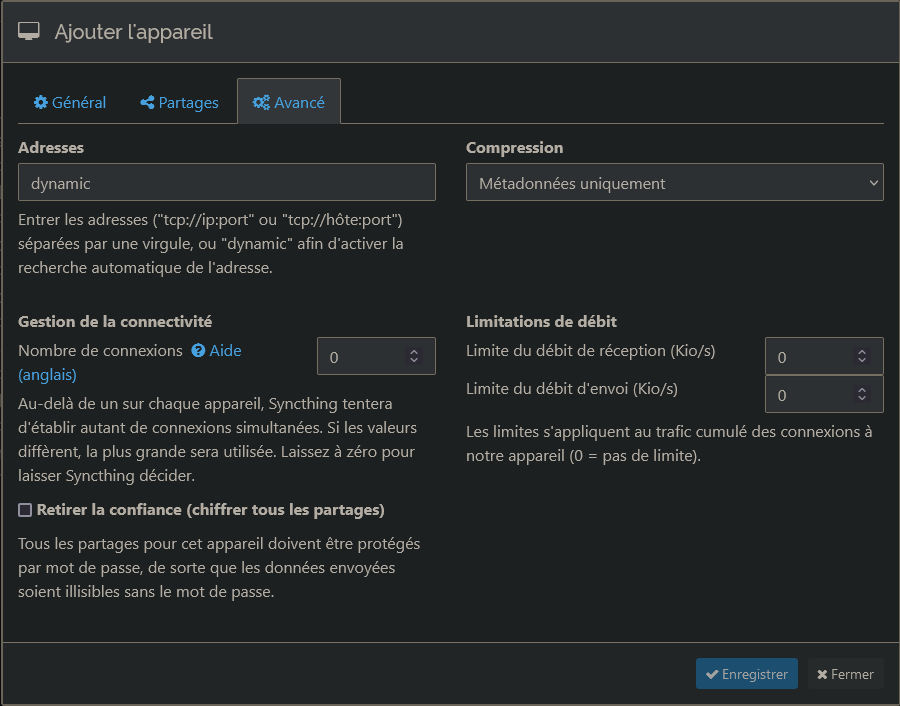 Le dernier onglet « Avancé » contient les informations de connexion entre les deux machines, comme les paramètres de connexion, les limites de débit ainsi qu’une option potentiellement utile si la machine sur laquelle les données sont synchronisés n’est pas sûre : « Retirer la confiance ».