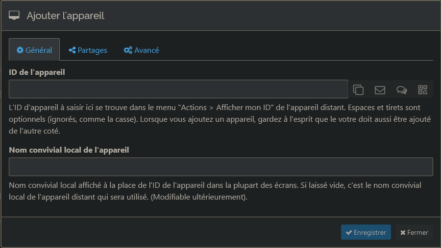 Sur chaque poste : cliquer sur Ajouter un appareil. La fenêtre qui s’ouvre permet de renseigner l’identifiant partagé précédemment, ainsi qu’un surnom.
