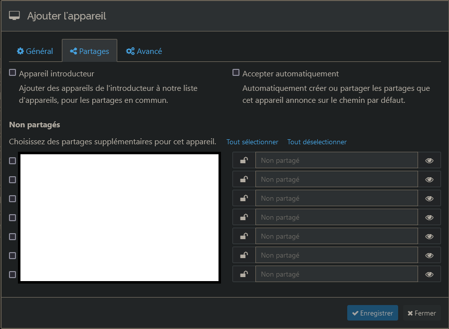 Pour ce faire, cliquer sur « Ajouter un partage » : le nom, l’identifiant ainsi que le chemin local vers le dossier à partager sont à renseigner (ex : C:\Documents\DossierdePartage)