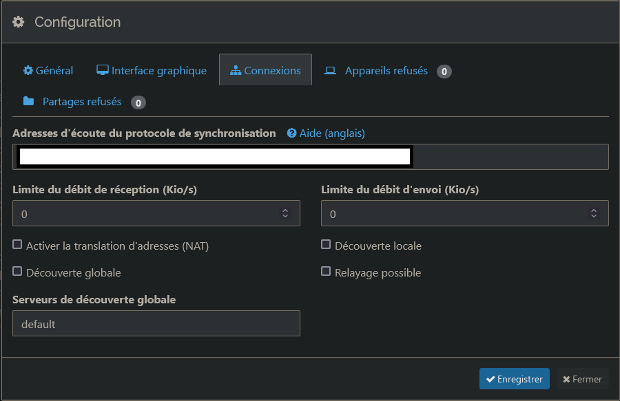 - Activer la translation d’adresses (NAT) : Permet à Syncthing de se connecter plus facilement au travers de routeurs et pare-feu.